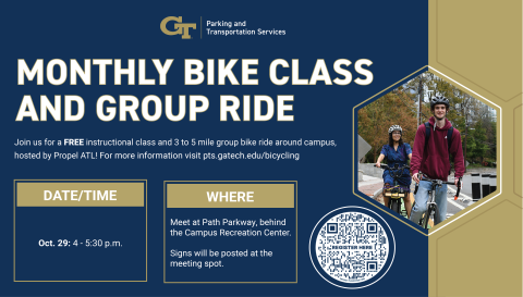 Get more comfortable traveling by bike with this instructional group ride! This in-person class is offered by Parking and Transportation Services in collaboration with Propel ATL and is designed specifically for members of the Georgia Tech community — that includes students, staff, and faculty!